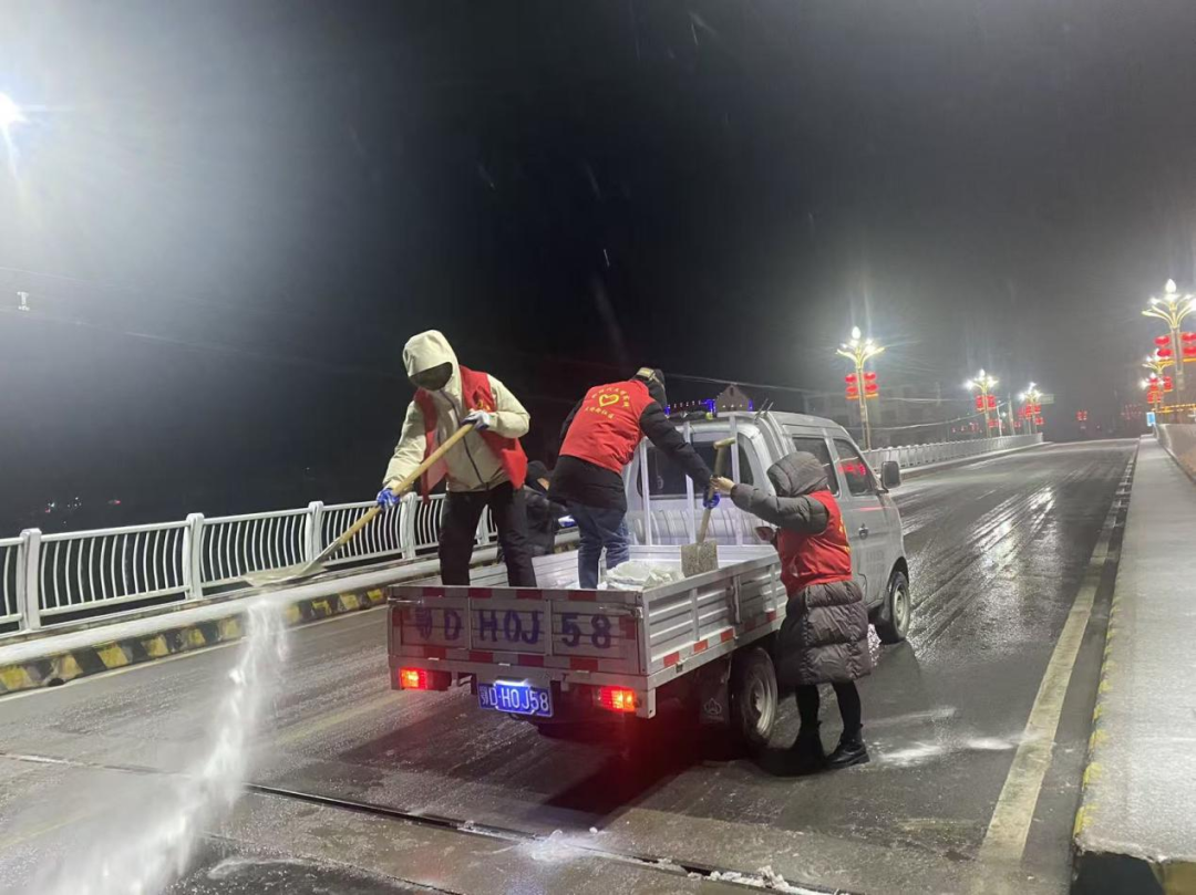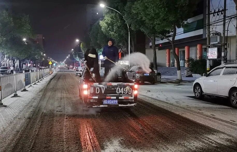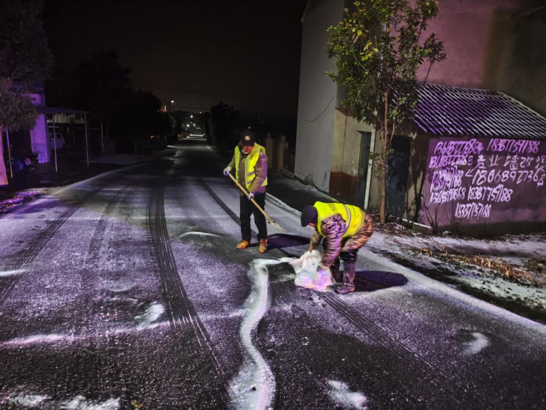 ▲新江口街道26个村(居)连夜组织党员干部、志愿者、业委会成员等,对城区主次干道开展撒盐融冰作业,保障道路畅通和市民出行安全。