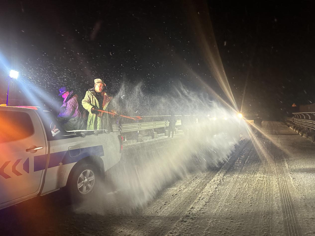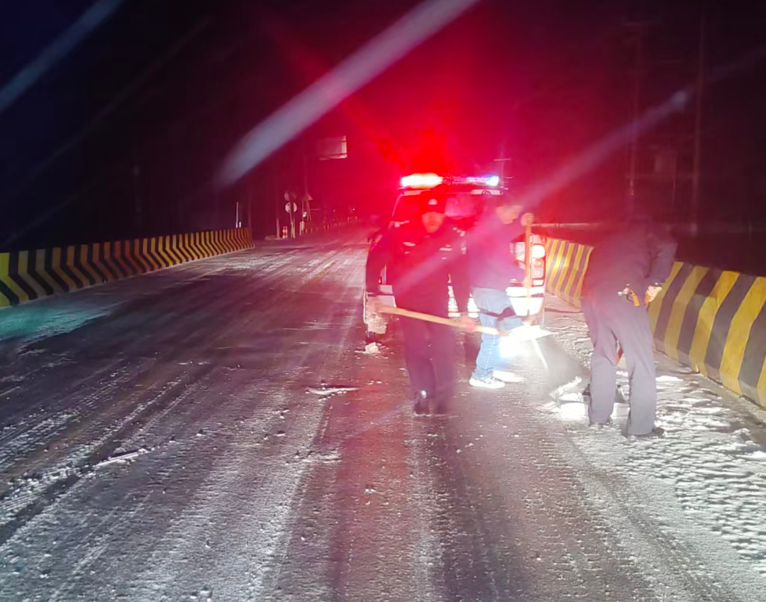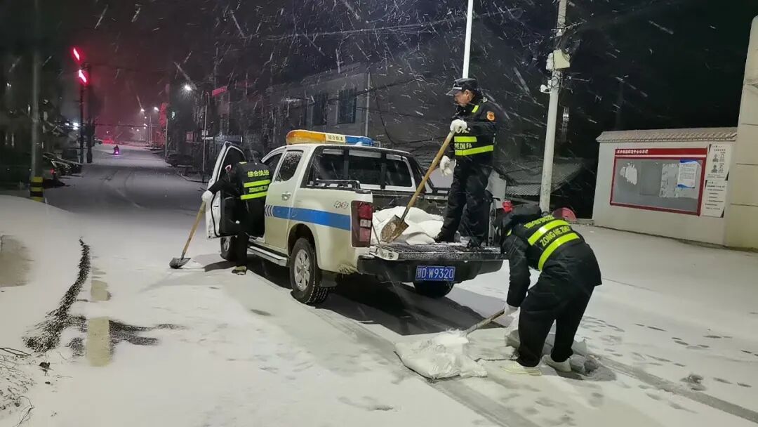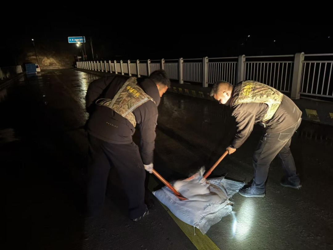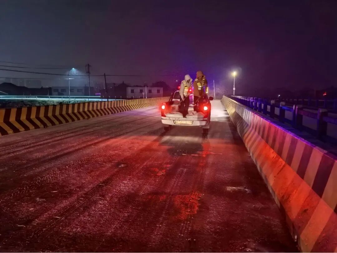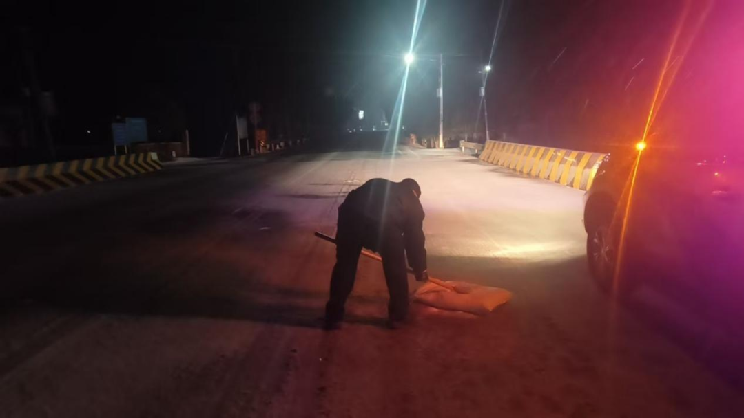▲老城镇连夜对新老路沿线抛洒融雪剂,预防道路结冰,保障道路畅通与群众出行安全。