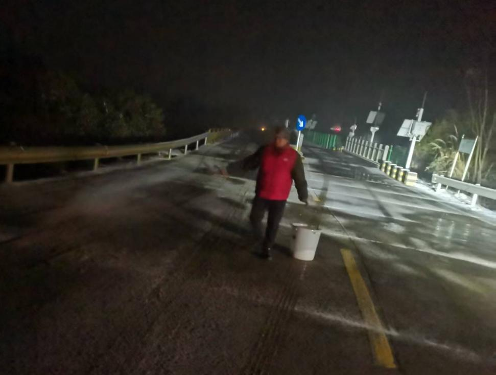 ▲洈水镇组织人员对重点路段、桥梁进行洒盐除雪作业。