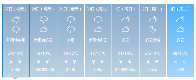 根据最新气象资料分析,预计27日夜间至28日白天,我市有一次较明显的降水过程,并伴有短时强降水、雷暴大风等强对流天气:27日夜间小到中雨,累计雨量10—20毫米,28日白天大雨转中雨,累计雨量20—30毫米;过程累计雨量30—50毫米,局部60—80毫米,最大小时雨强20—40毫米。受冷空气影响,风力增大,北风4到5级,阵风6到8级;气温下降,平均气温下降4—6℃,最高气温降至20℃以下。