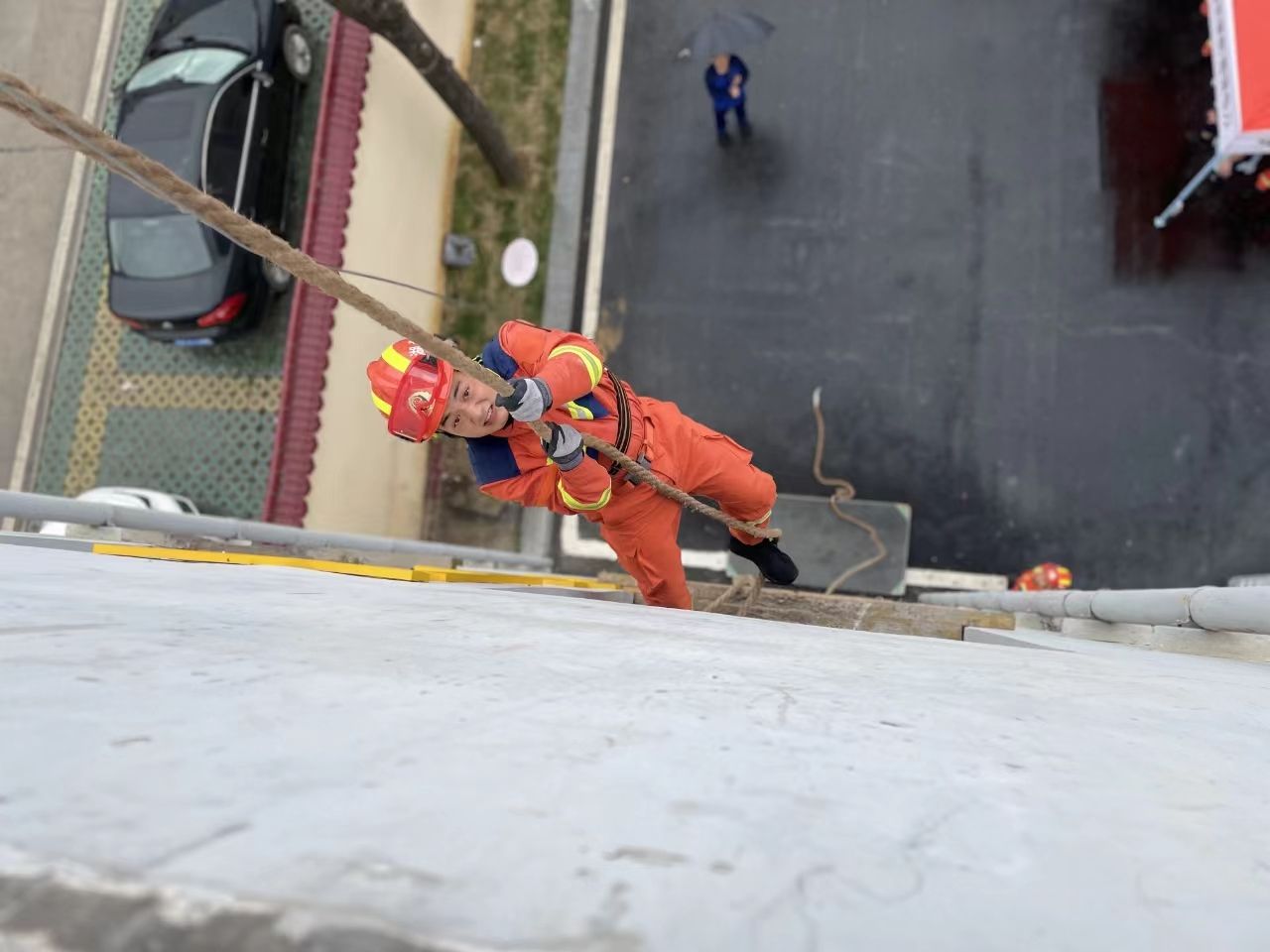在绳索攀爬比赛项目中,消防员们身轻如燕,灵活敏捷,两手握住绳索,手脚配合,长期的训练与磨砺中铸就了轻松攀登四楼的本领。