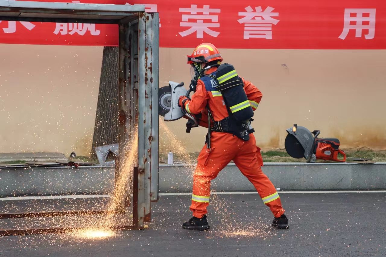 “预备!开始!”口令和信号枪声落下的同时,橙色身影冲出,翻越两米高的板障、发动机动链锯切割圆木、组装佩戴空气呼吸器、发动无齿锯破拆防盗门……一系列复杂的动作都在参赛人员的行动中有序进行,“化繁为简”、一气呵成。