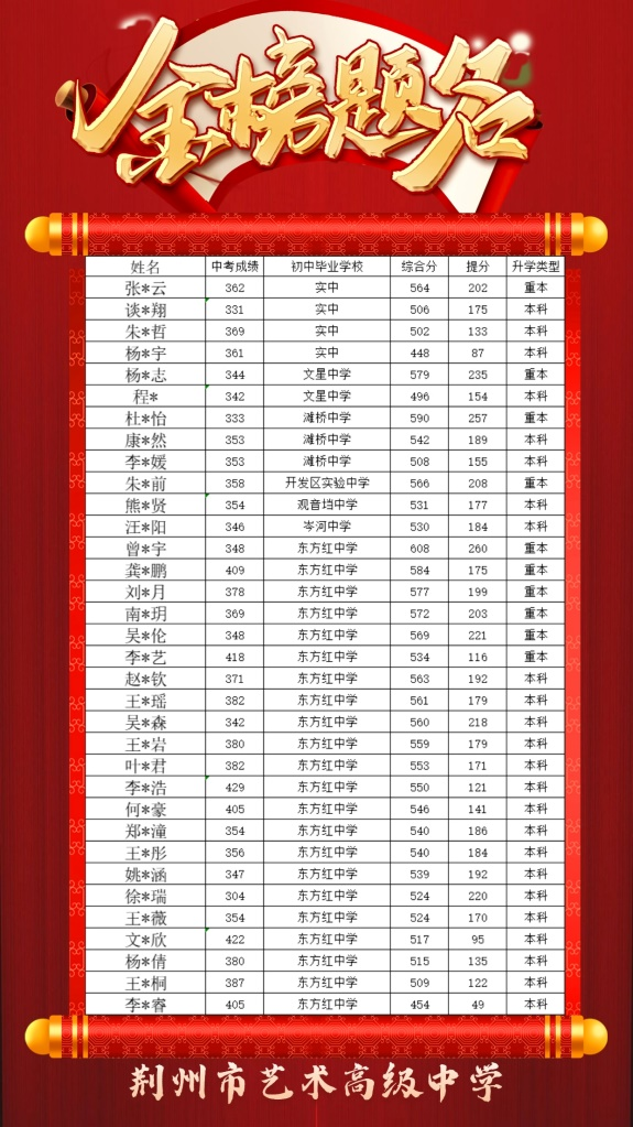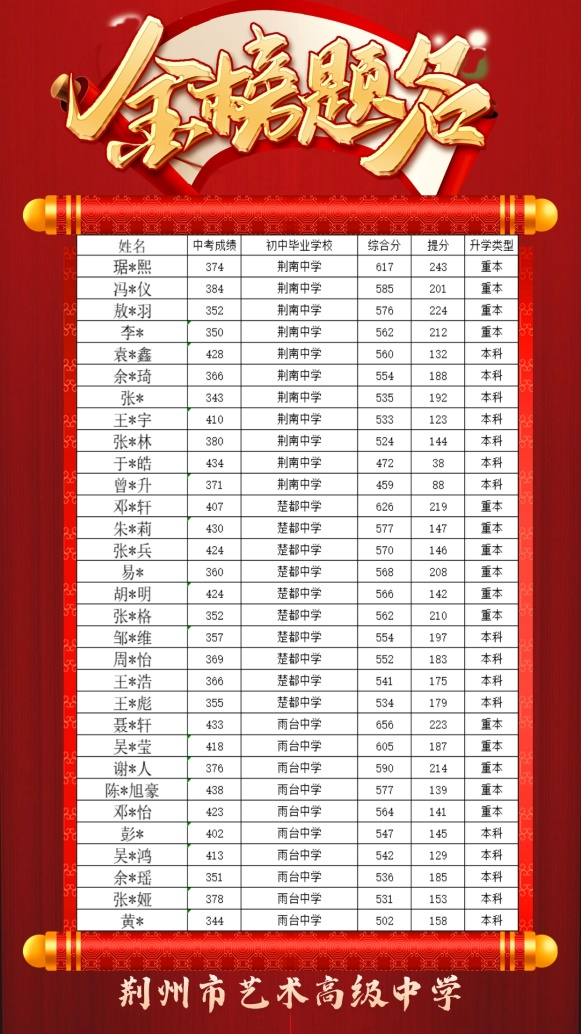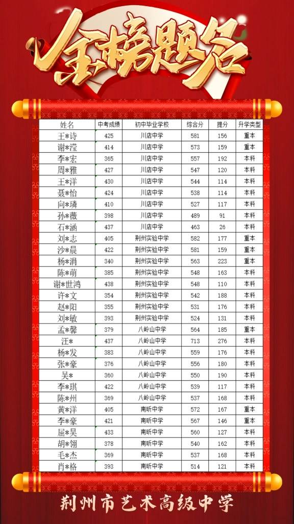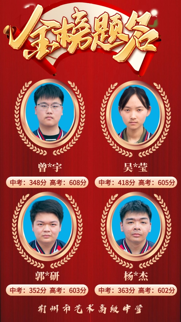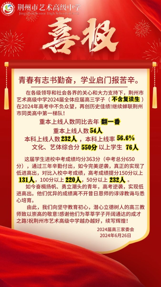 2024年荆州艺术高中应届生(不含复读生)本科升学率再创新高,本科上线人数同比上年翻一番,重本上线人数54人,本科上线人数232人,本科过线率56.6%,文化、艺体综合分550分以上学生76人,高考逆袭,真正的实现了低进高出,对比入校中考成绩,高考成绩提分150分以上131人,100分以上220人,50分以上232人。