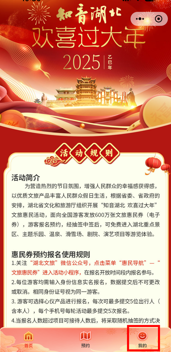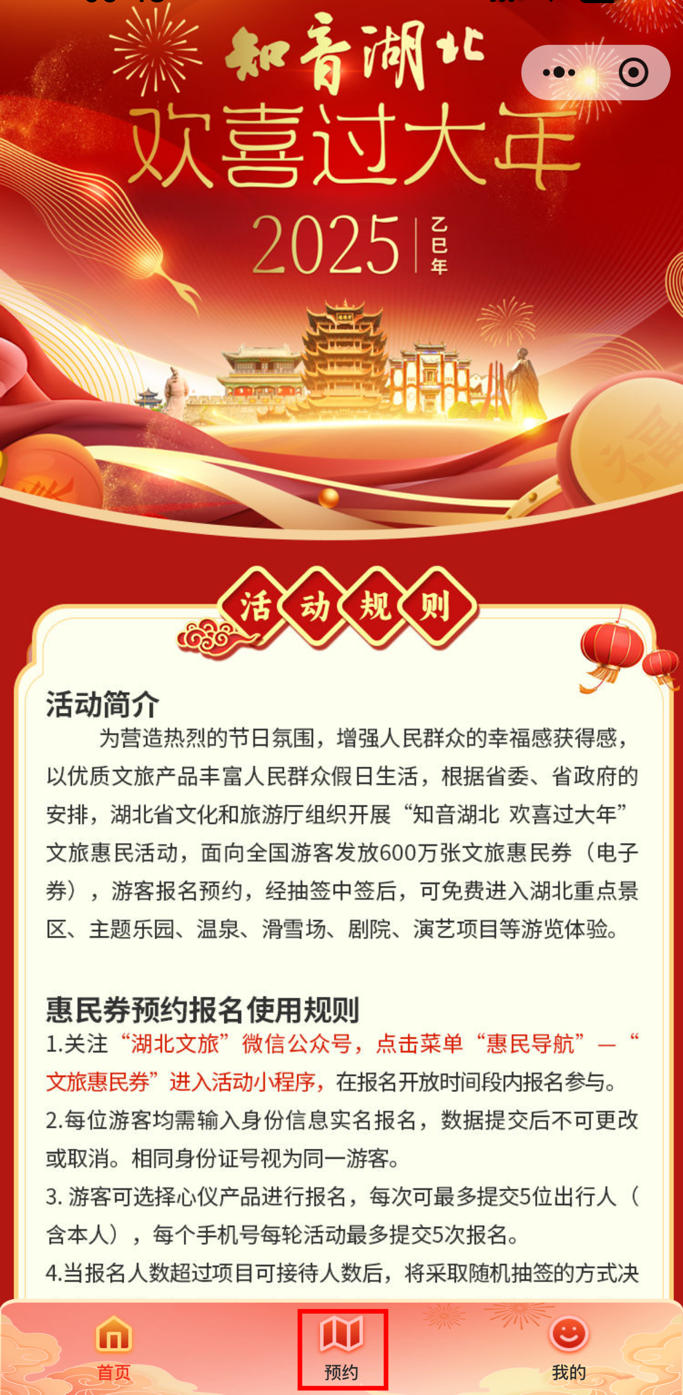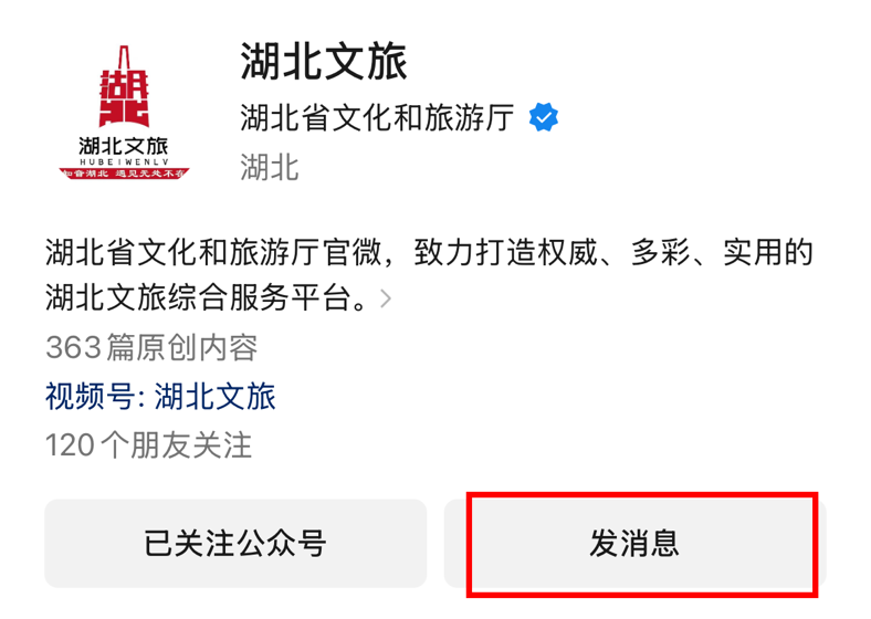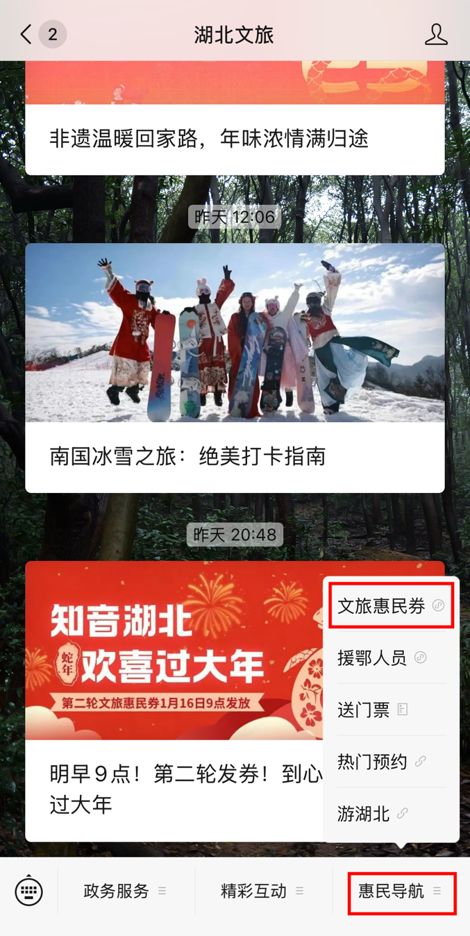 第一步:关注“湖北文旅”微信公众号点击“发消息”,选择底部菜单“惠民导航”—“文旅惠民券”。