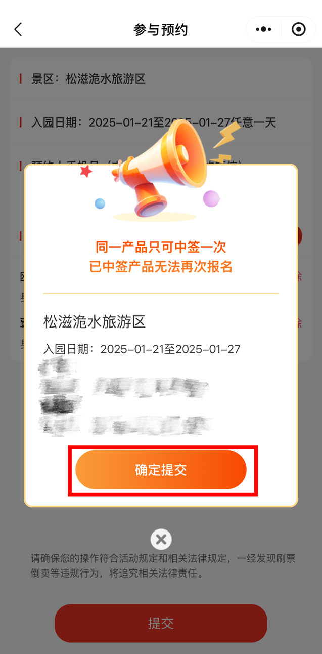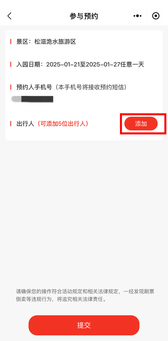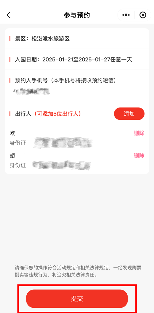 答:对同一个景区,添加出行人是唯一的,一个手机号提交成功后,其它手机号无法再次提交这个身份证号。