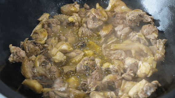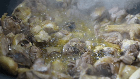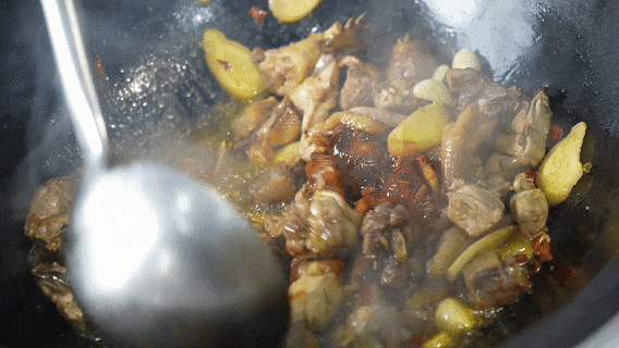 放入生姜、大蒜、八角、桂皮,为鸡块提香,