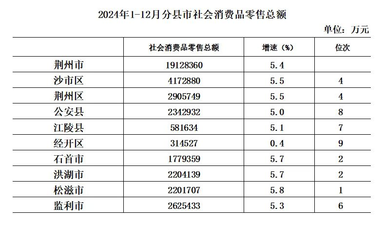 城市发展显成效。2024年1-12月,松滋市社会消费品零售总额达220.17亿元,同比增长5.8%,增速居荆州市首位。同时,成功申报并通过“省级县域商业体系试点县”,入选第二批全国县域商业“领跑县”。