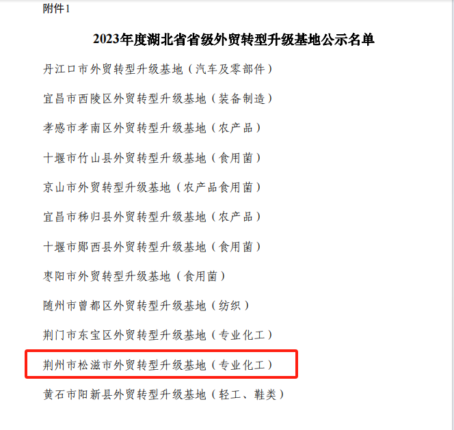 基地获批增动能。5月15日,松滋市省级外贸转型升级基地(专业化工)获批,增强外贸发展动能。