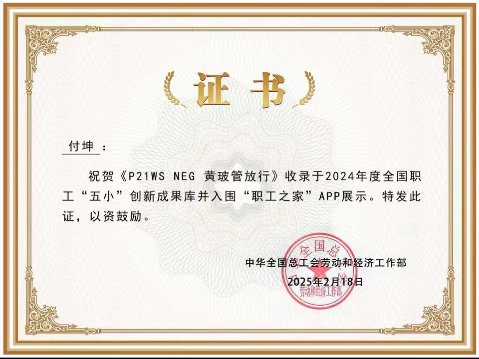 近日,全国总工会公布了2024年度全国职工“五小”创新库录入名单。由松滋市总工会与亮锐科技(湖北)有限公司联合推荐的付坤创新项目——P21WSA NEG 黄玻管放行项目,成功入选全国总工会“五小”创新成果库,并入围“职工之家”APP展示。