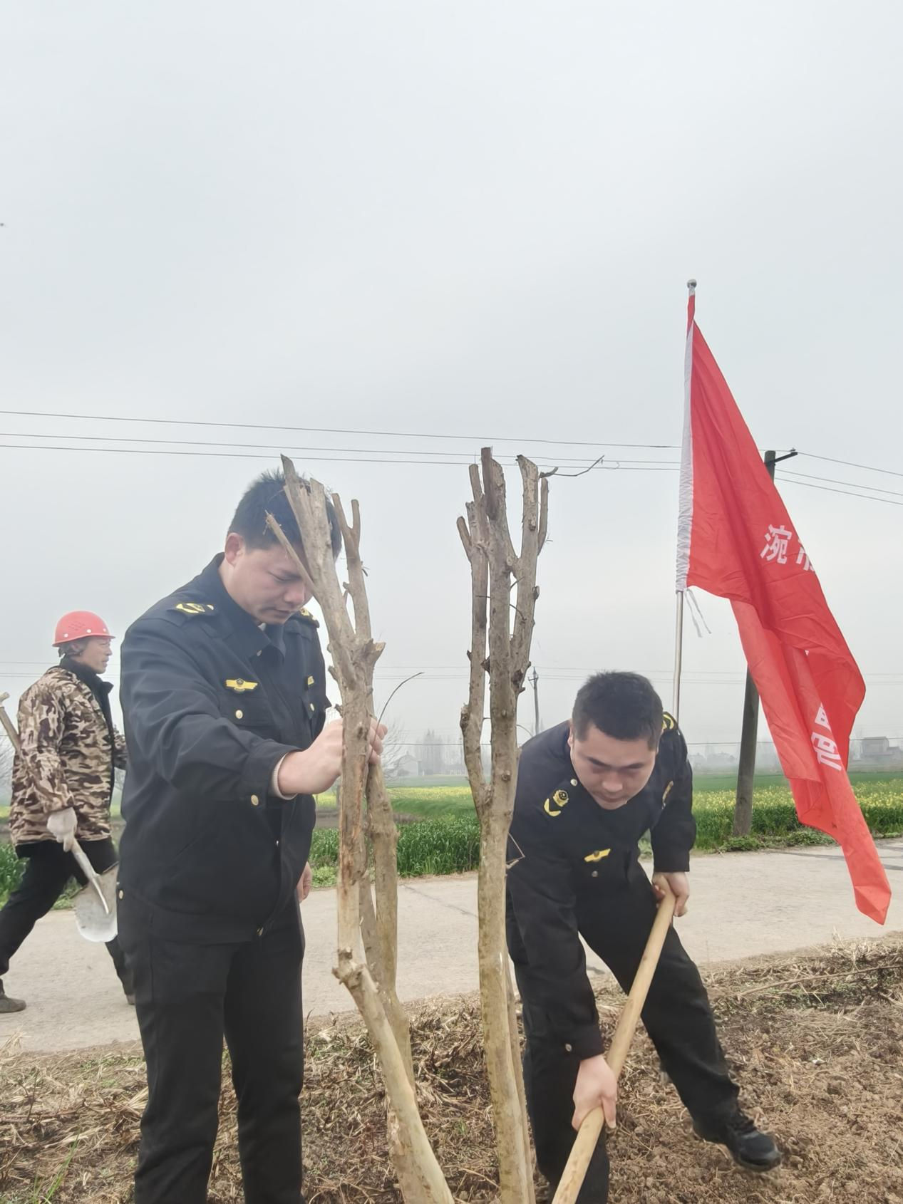 植树现场,大家手持工具,卷起衣袖,热情高涨。从挥锹挖坑、搬运树苗,到扶苗栽种、填土踩实,再到浇水养护,每一步都严谨细致,各个环节默契配合,确保树苗栽种一片、成活一片、美化一片。经过一上午的辛勤劳作,一株株新苗扎根大地,为初春的田野注入了勃勃生机与活力。