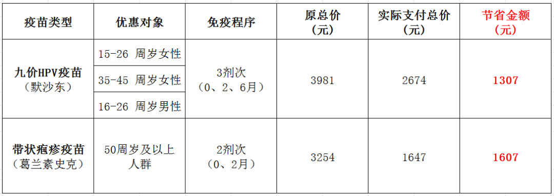 适龄人群须在活动规定时间内完成首针及全程接种,否则不享受活动优惠。带状疱疹疫苗(葛兰素史克)按照原价(1607元/剂次)的1/2收取每剂次疫苗费用,每剂次另收取接种服务费20元。九价HPV疫苗(默沙东)按照原价(1307元/剂次)的2/3收取每剂次疫苗费用,每剂次另收取接种服务费20元。接种原则:知情、同意、自费、自愿。