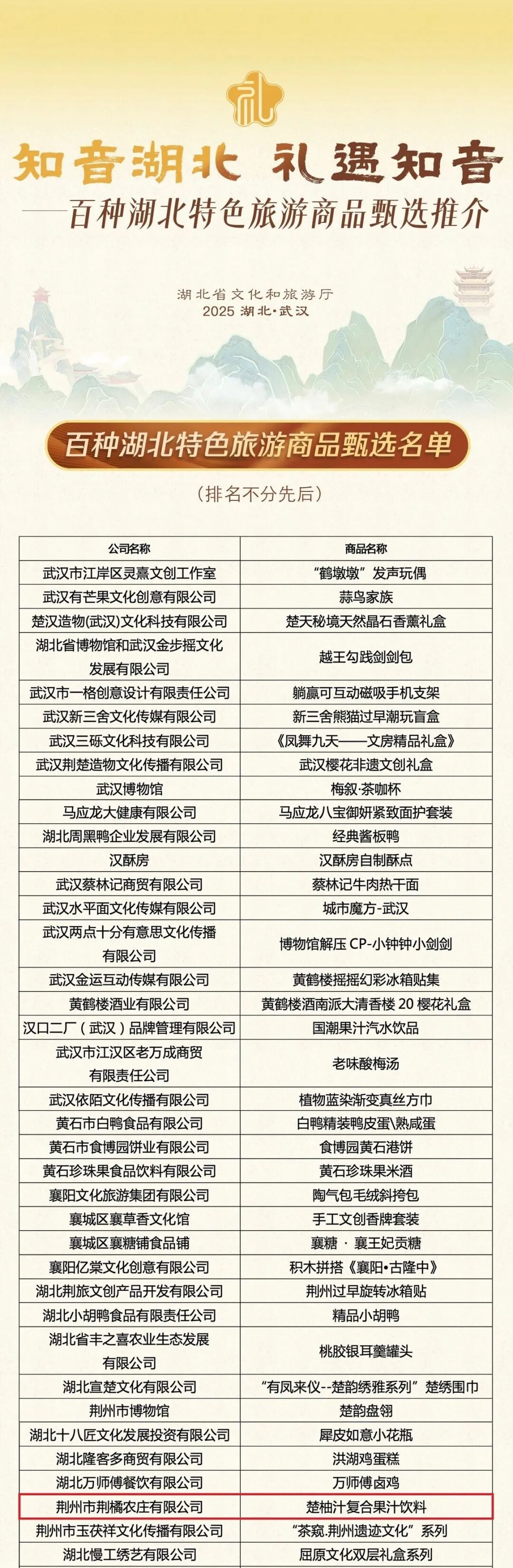 本次活动是深入贯彻落实《关于实施文化创新战略整体提升支点文化影响力的行动方案》要求,加快推进旅游商品“双百”计划的关键举措和具体行动。湖北省首次系统性地推出百种特色旅游商品,旨在聚焦“产销融合与消费拉动”,助力湖北匠心好物走向更广阔市场,建立旅游消费新场景。活动自启动以来,吸引了全省千件文旅商品参与角逐。最终,我市选送的楚柚汁复合果汁饮料成功入选。