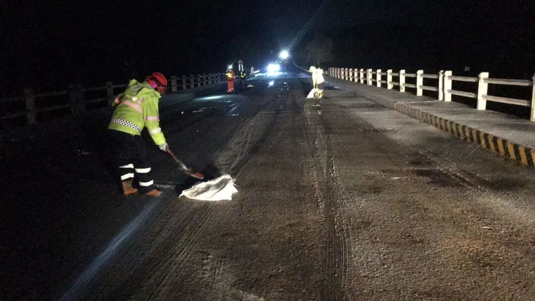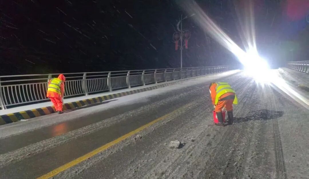 ▲老城镇连夜对新老路沿线抛洒融雪剂,预防道路结冰,保障道路畅通与群众出行安全。