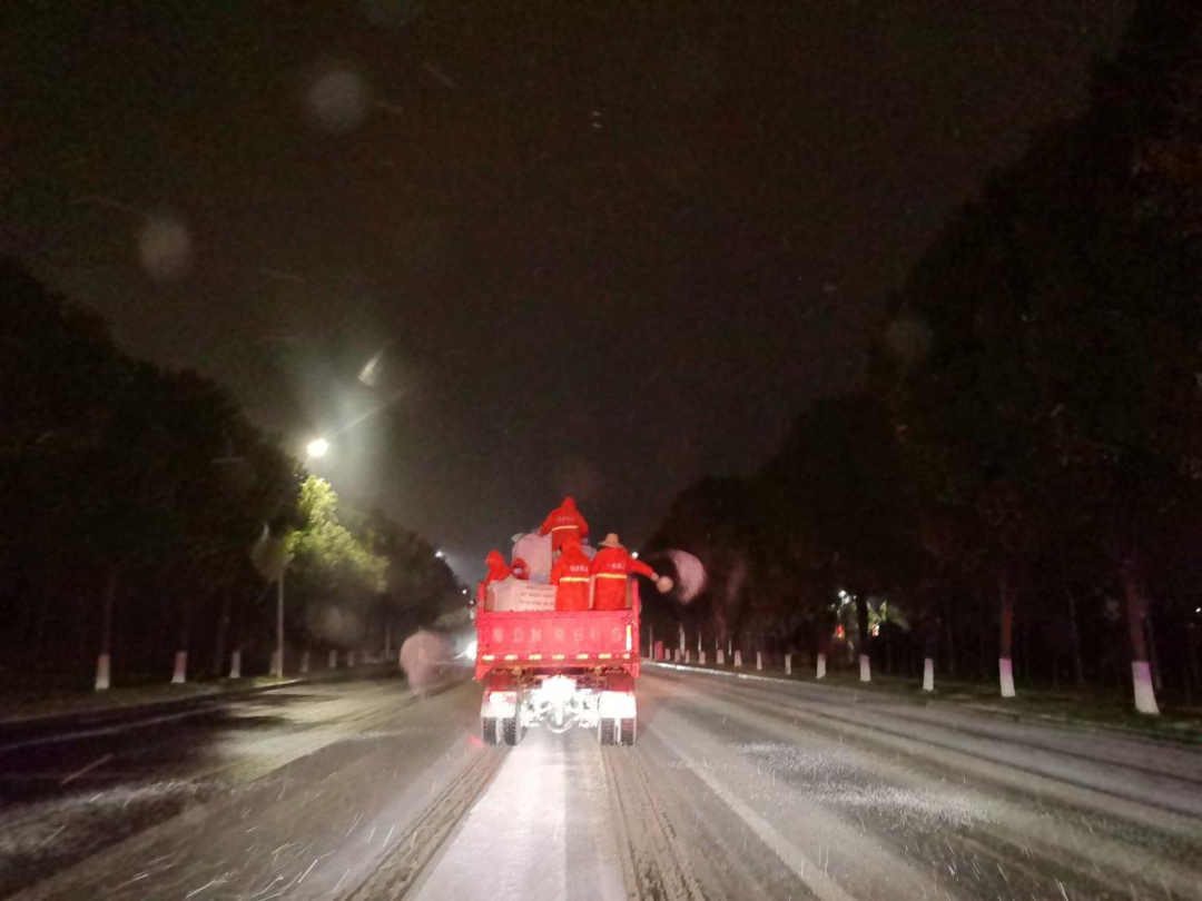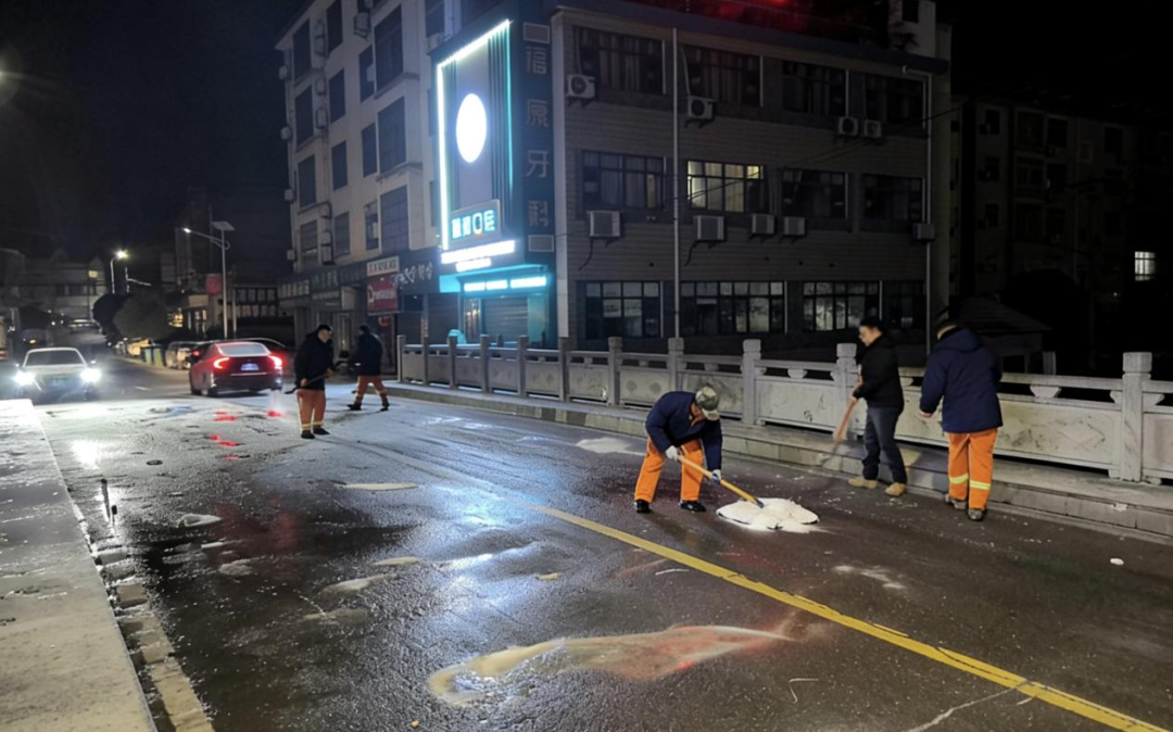 ▲新江口街道26个村(居)连夜组织党员干部、志愿者、业委会成员等,对城区主次干道开展撒盐融冰作业,保障道路畅通和市民出行安全。