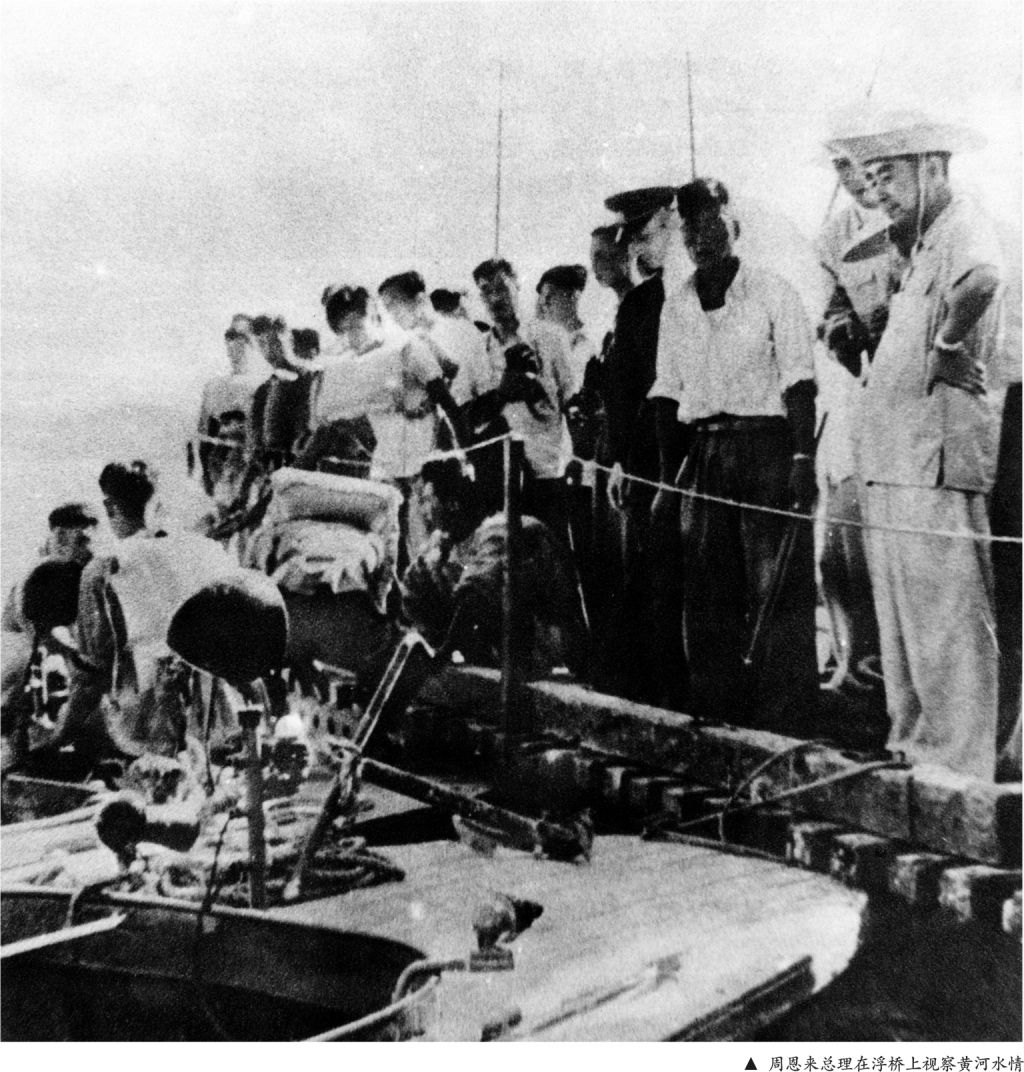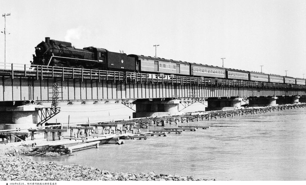1958年7月18日,中共中央副主席、国务院总理周恩来乘专机来到河南郑州,巡视了被洪水冲断的郑州黄河铁路桥,专门听取了黄河防汛指挥部的汇报,提出了抢修大桥“要依靠群众,固守大堤,不分洪、不滞洪”的指导思想。