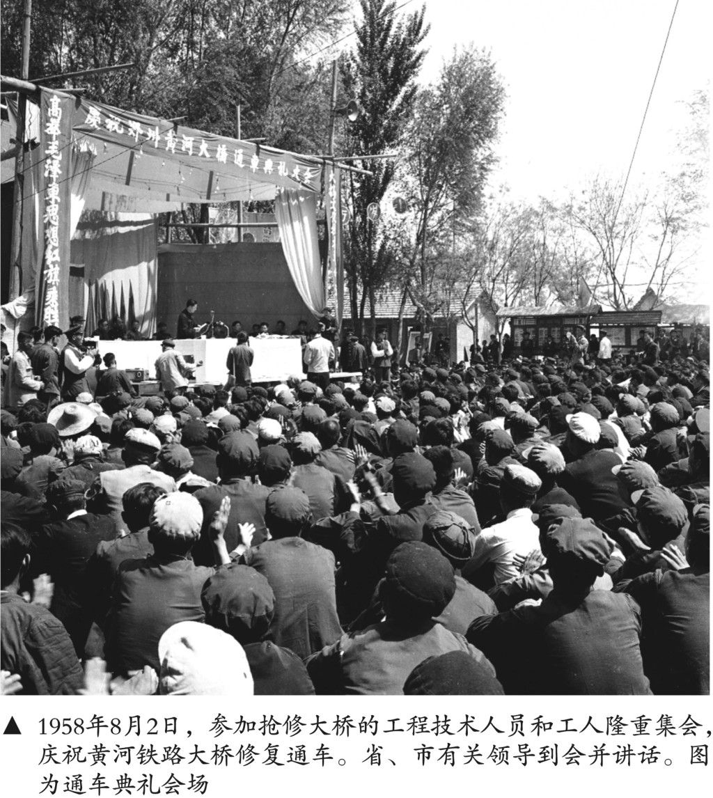 1958年8月5日,周总理再一次来到郑州视察了修复通车的京广线黄河铁路大桥。视察中,周总理向抢修大桥的职工表示亲切慰问,并称赞他们“在确保工程质量优良的前提下,迅速修复了大桥”是一个创举。